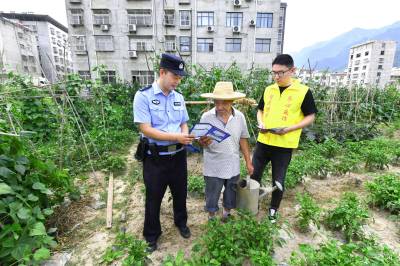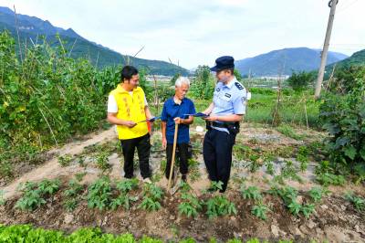 2023年8月7日,保康县公安局寺坪派出所民警走进田间地头向群众讲解反电诈常识。