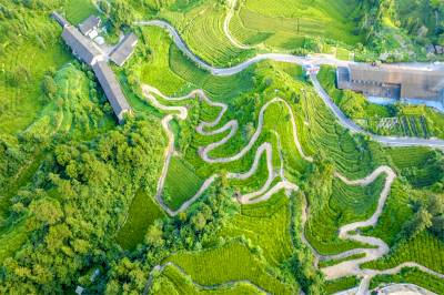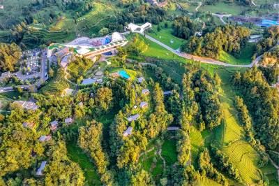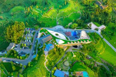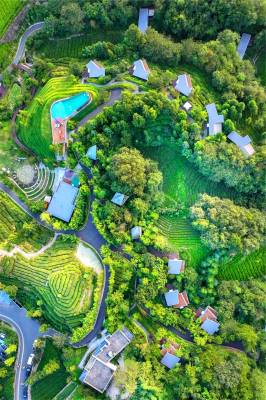 2023年8月4日,宜昌市夷陵区邓村乡三峡茶旅小镇艺术展示中心一带,清翠茶园涌碧荡翠,特色民宿点缀其中,翠绿茶林将大地无缝隙覆盖,如海浪般舒展开去的茶园绵延群山,处处弥漫着茗香的气息,夏日生态茶园呈现如诗如画风景,迎来无数游客在此避暑纳凉。