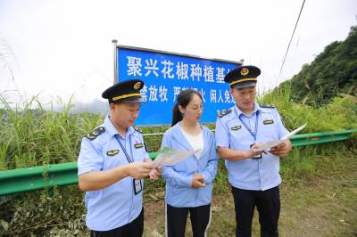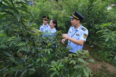 8月9日,湖北省竹山县市场监管局上庸市场监管所工作人员,深入上庸镇九里潭村的竹山聚兴花椒种植专业合作社,向合作社理事长梁荣莉了解九叶青花椒产量、销售等情况,为合作社提供商标注册等系列精准服务。