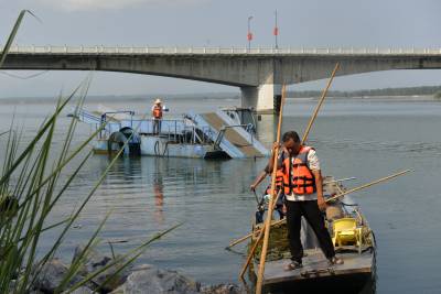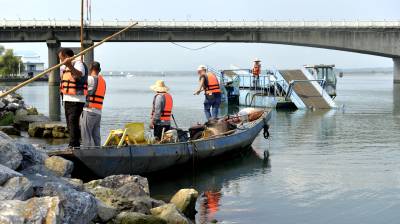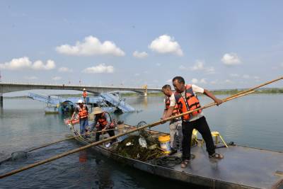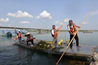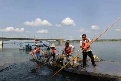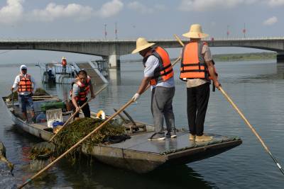 8月24日,在湖北省老河口市光化大桥附近水域,4艘机动打捞船行驶在江面上,10多名队员手持工具,正忙着把水里的漂浮杂物打捞到船上。