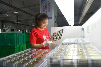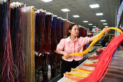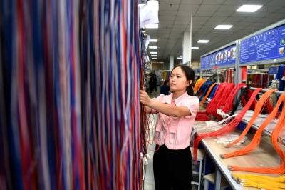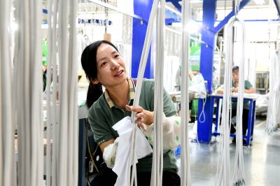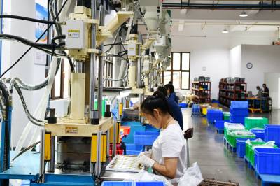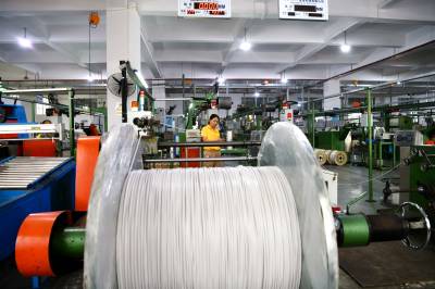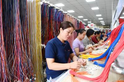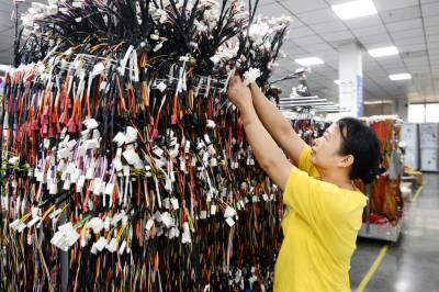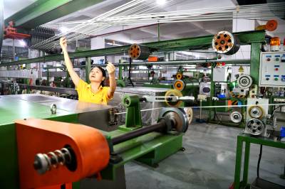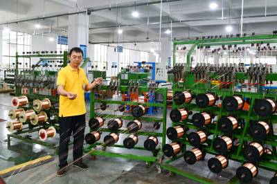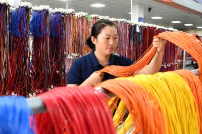 2023年8月28日,在湖北省咸宁市通城县坪山高新技术孵化园一家电子公司车间内,工人们正在生产、检测线电线、电子产品,赶制出口订单。