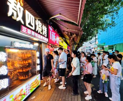 8月27日,湖北省武汉市江汉区前进五路美食街,沿街的80多家餐饮店都忙碌的经营着各有特色的烧烤生意,目前所有餐饮店告别了瓶装液化气,已经全部改用了绿色环保的电能源,江汉区花楼水塔街道,为餐饮店节省了开支增加了收入经营更安心,让消费者无后顾之忧。前进五路美食街比邻繁华的中山大道和江汉路,是老汉口人流量最大的街区之一。它己成为本地市民最喜欢逛吃,武汉大学生青年和外地游客慕名而至的网红美食街。每天人流量在1到2万,节假日高峰值达到3万。