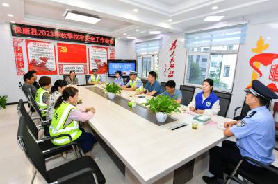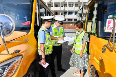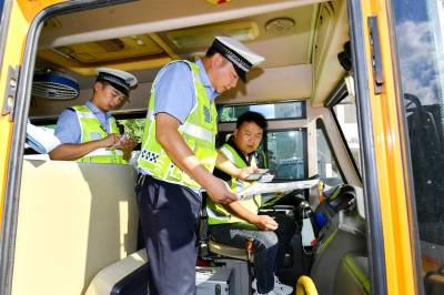 2023年8月28日下午,在保康县城关镇小学,所辖交警正在对校车的安全性能进行检查,消除校车安全隐患,迎接新学期的到来。