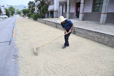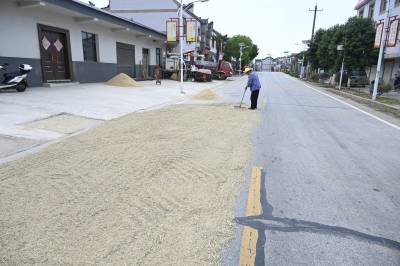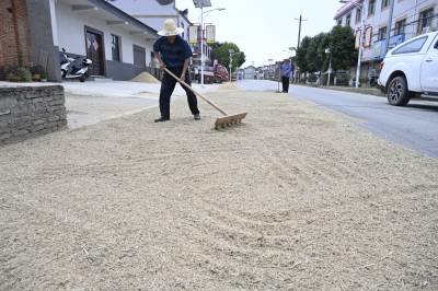 9月5日,十堰市郧阳区安阳镇李营村农民在晾晒早稻。进入秋季,十堰市郧阳区各地早稻、中稻陆续进入收获季节,今年风调雨顺,秋收作物预计是个丰收年。视界网王涛摄