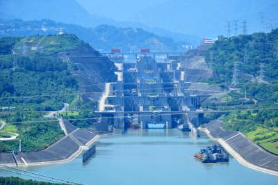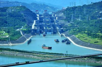 2023年9月5日,在宜昌市夷陵区三斗坪镇境内拍摄的货船有序通过三峡工程双线五级船闸的场景。今年8月,宜昌三峡工程双线五级船闸共运行965闸次,通过船舶3737艘次,过闸货运量超1571万吨。三峡船闸投运20年来,首次月货运量超过1500万吨。
