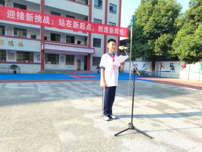 六年级周文斌同学作为学生代表,欢迎新同学的到来,对老师的谆谆教诲表示感谢,同时也提出了新学期新目标与新计划。呼吁同学们养成良好的行为习惯、学习习惯,处处严格要求自己,在新学期取得更大的进步。