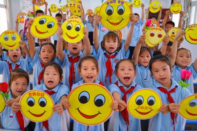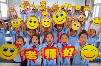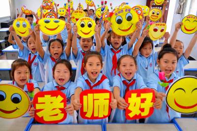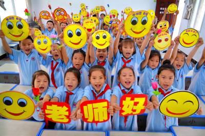 2023年9月7日,湖北省十堰市郧阳区柳陂镇中心小学,小学生在展示祝福“笑脸”和祝福卡。