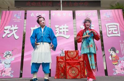9月14日,郧阳区青曲镇初级中学的学生在郧阳区民俗文化展演中心老师的指导下学习戏曲动作、戏曲表演,同时欣赏富有地方特色的《柜中缘》节目,感受戏曲艺术。