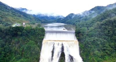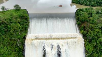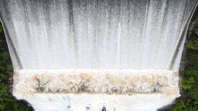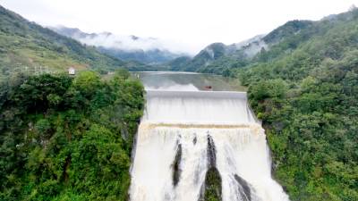 2023年10月2日,航拍的十堰市房县汪家河水库溢洪鸟瞰图,洪水溢流量创10年来最大。中秋国庆“两节”期间,房县持续多降雨发生,76座中小型水库水位普遍上涨。部分水库洪水溢流量为近年来新高。为了严防秋汛,保障人民平安过好“两节”假期,当地各级各部门及时掌握水情、雨情、汛情、工情,压紧压实防汛值班值守责任,加强巡查防守力量,确保水库工程安全度汛、人民群众生命财产安全。目前,当地水库工程安全运行,无人员伤亡事故发生。