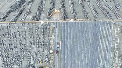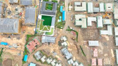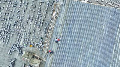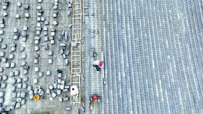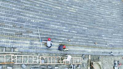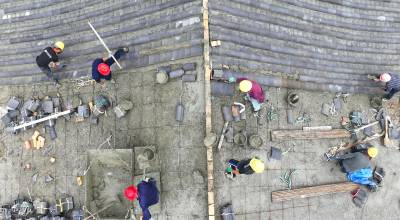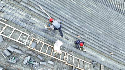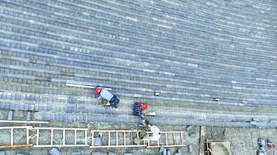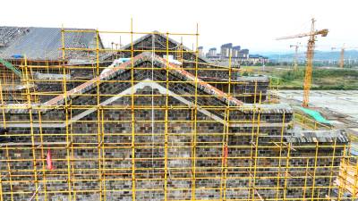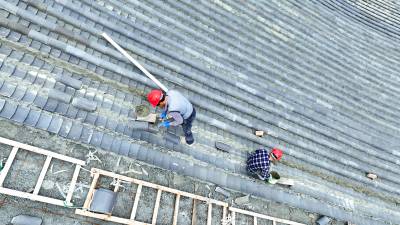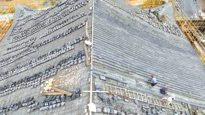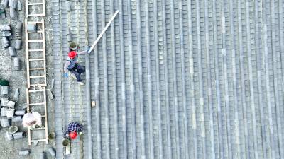 2023年10月3日,十堰市房县西关印象二期工程(中国•房县诗经城)建设如火如荼,图为施工人员正在铺盖仿古明清时代建筑流离瓦。“两节”假日不打烊,房县西关印象二期工程(中国房县诗经城)建设加速推进,该工程于2022年10月开工建设。