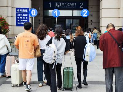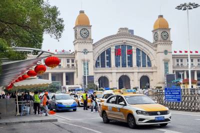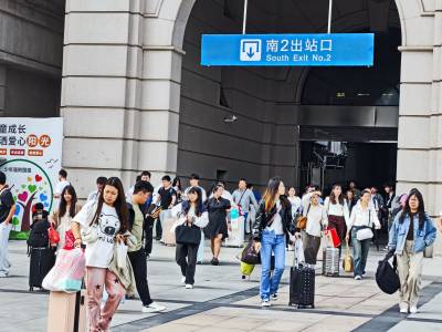 10月5日,在武汉汉口火车站站前广场上有川流不息进出武汉市的市民和旅客,中秋国庆小长假期进入尾声,汉口火车站站前广场迎来假期返程进城的高峰。