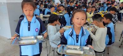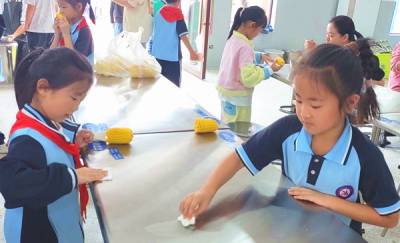就餐期间,各班学生在指定的窗口前有序打餐,打饭量力而行,就餐对号入座,安静就餐,吃光盘中的食物并带走餐桌上的垃圾,用纸巾擦拭桌面,把凳子摆放整齐,列队出食堂。“我们是第二批就餐的,看到光洁的桌子和干净的凳子,吃起饭来都很开心。所以,我要把这种开心传递下去。”一名三年级学生就餐后随手拿出纸巾细致地擦桌子。