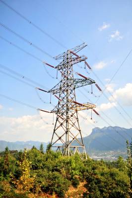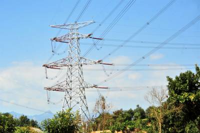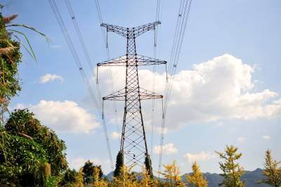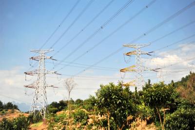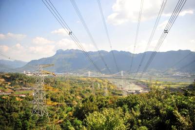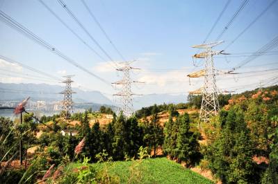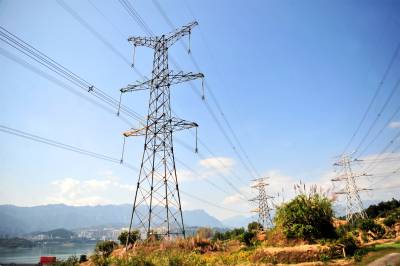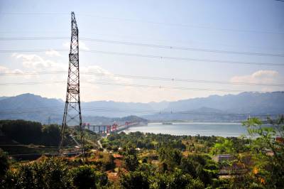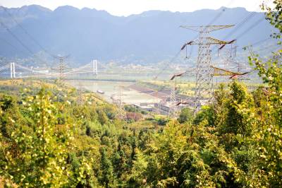 2023年10月20日,在长江三峡工程北岸的宜昌市夷陵区太平溪镇境内,蓝天白云映耀下的三峡输电铁塔和电网风景。