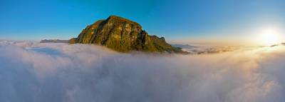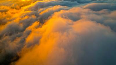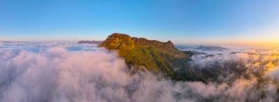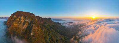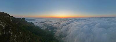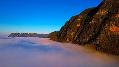 忽而,一阵秋风袭来,云海借助风力迎着霞光腾云驾雾,壮阔如海,奔涌翻飞,犹如钱江观潮,一浪接着一浪高。重峦叠嶂之间,云海波涛滚滚,如万马奔腾,似沙尘暴涌。太阳光芒四射,活力无穷,把云海映照得金光灿灿,景象万千,太阳、云海、秋风、山峦合力上演出一场气势恢宏的视觉盛宴。