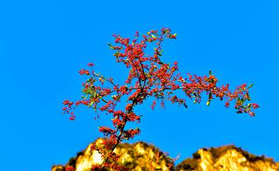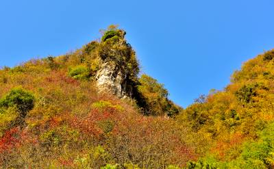 山顶之上,视野开阔,登高望远处,一览众山小。仰望苍穹,秋高气爽,万里晴空,一碧如洗。远可观武当金顶,近可见羊尾前山;举目滔滔汉江河蜿蜒如龙,远眺潺潺金钱河玉带似银;环顾扫描娘娘山,山势形似躺椅,横卧在秦岭余脉群山之间,由东北向西南延伸。林疏叶红,层林尽染,石林耸立,层峦叠嶂。鹰翔鸟飞、兽吼鸟鸣时有见闻;奇花异木、珍药稀草唾手可得。谓之宝山也不为过。