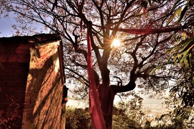 山顶现仍存有一座娘娘古庙,据考证其乃乾隆56年所建,庙旁两颗古朗树挺拔屹立,虽因深秋叶色枯黄,但依稀可知其历经风雨洗礼,见证沧桑,不畏风霜,硬朗健壮。据当地老人介绍,此树已有300年树龄。