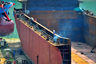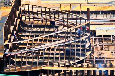 2023年10月22日,位于长江西陵峡畔的宜昌市夷陵区乐天溪造船基地,工人们忙着加工制造大型货船。