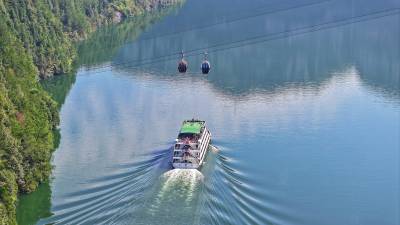 2023年10月16日,湖北省恩施土家族苗族自治州恩施市新塘乡红花峰林清江流域,游船行驶在清澈碧澄的清江上,宛如画中游。 清江,长江一级支流,因“水色清明十丈,人见其清澄”,故人们称之为清江。近年来,恩施州生态环境不断改善,优美的自然风光和丰厚的人文底蕴,吸引越来越多的人前来观光旅游。(视界网 张远明 摄)