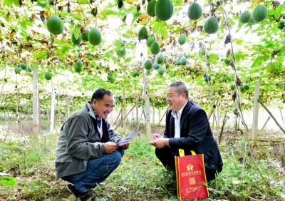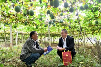 2023年10月25日,十堰市郧县农商银行信贷员杨波(右)深入到该区白桑关镇庄房村一组村民姚华(左)的瓜蒌基地现场授信20万元贷款用于收购药用瓜蒌。姚华在当地农商行的贷款支持下种植了20亩瓜蒌,并创办瓜蒌合作社,带动15户村民种植瓜蒌100多亩,户均年收入10万元以上。