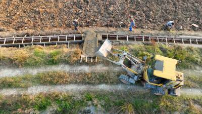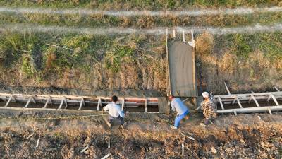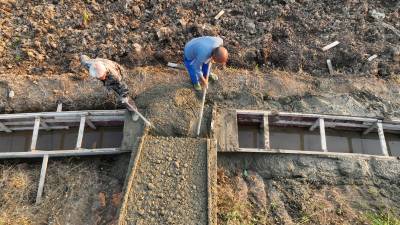 2023年11月2日,十堰市房县白鹤镇石堰河村旱地改水田片区,施工人员正在修建节水灌溉渠道。入秋以来,房县秋冬季农田水利建设全线铺开,修水渠、建设农村安全饮水、旱改水、供水水源等中小型水利项目,补齐水利“短板”,福祉民生、促进农业提质增效、粮食稳产高产。目前,该县完成建设农村饮水安全巩固提升项目20处,正在建设12处,续建供水水源工程2个,小型水利与河道治理项目建设全面加速推进。