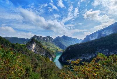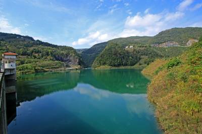 11月6日,秋高气爽,恩施市境内喻家河水库在晴朗的天空映射下,好一幅蓝天碧水的绝美风景画。