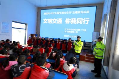 “在公路上行走要集中注意力,横过马路要走人行横道。”“不在马路上追逐嬉戏打闹,自觉抵制边走路边看书的不良出行习惯。”“未满12周岁的同学,不准在道路上骑自行车。”“乘坐两轮摩托车时,一定要正确佩戴安全头盔。” ……11月29日,竹山县公安局交警二中队民辅警走进宝丰镇双坝小学,对师生进行2023年122“全国交通安全日”主题宣传活动,确保师生文明出行、平安出行。