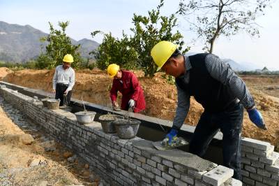 2023年12月6日, 湖北省咸宁市通城县东冲灌区续建配套与节水改造项目工地上,工人正在进行灌区施工。