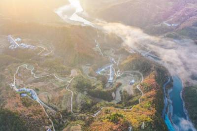 2023年12月6日,在竹溪县鄂坪乡西湾村俯瞰蜿蜒盘旋环绕山乡的农村公路,与宜居、宜业村庄民居,村民冬闲耕作的“镙纹”田园、河流、晨雾、多彩冬景相融一体,气象万千的美丽乡村画卷。