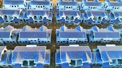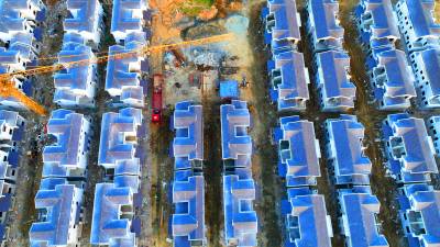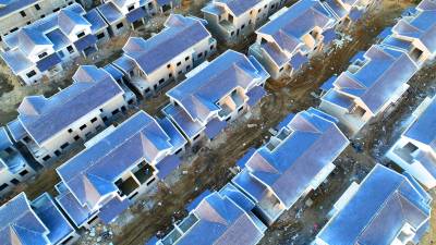 2023年12月5日,使用无人机航拍的十堰市房县方家畈水库移民新村,一幢幢暖冬房尽收眼帘。目前,房县2022年新建的堰河水库的移民小区79套安置房已正式封顶,刷粉墙体正在进行中,预计今年12月底以前,移民将住进温暖房。