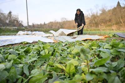 2023年12月23日冬至时节,湖北省十堰市郧阳区茶店镇长坪村2组村民正在地里管理蔬菜,确保蔬菜安全过冬,春节期间供应市场。视界网王涛摄