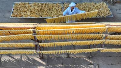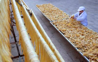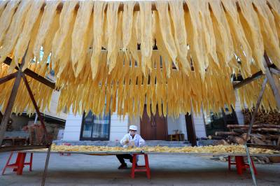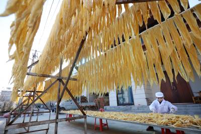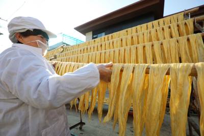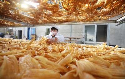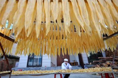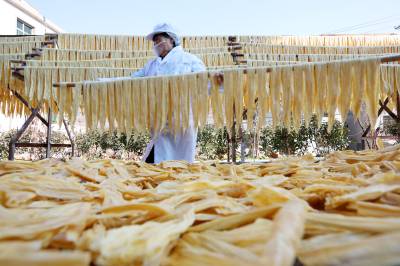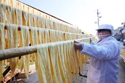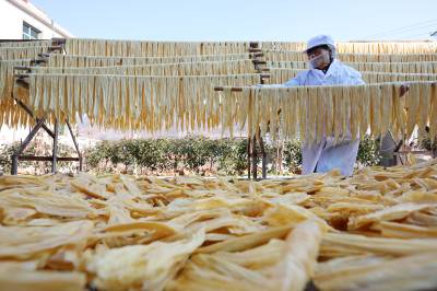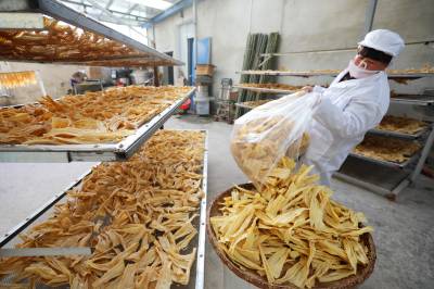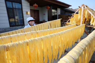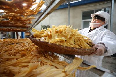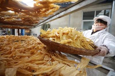 2023年12月23日,十堰市奕盛农产品电子商务有限公司工人段玉香在晾晒手工豆油精,该公司位于房县白鹤镇赤岩村。