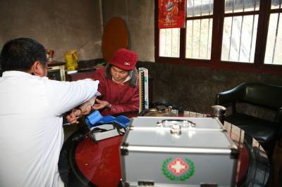除了在卫生室为村民们看病,面对一些行动不便的患者,他一般都会上门服务,走村入户是他最常做的事情。如今的农村,在家的都是六十至七十岁的老年人,而且他们子女都不在身边,周自兵就承担起了照顾他们健康的重任。