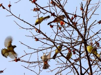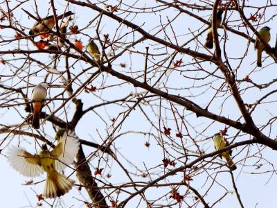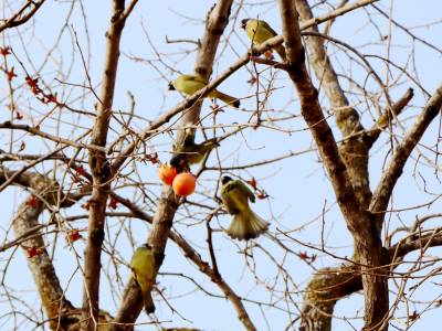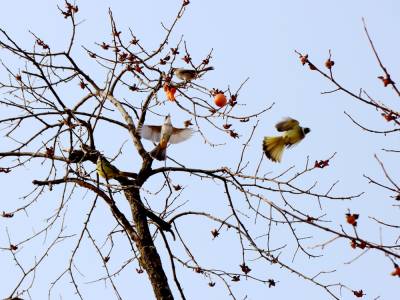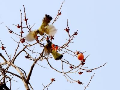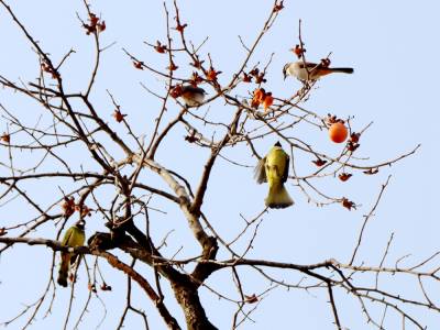 12月27日,笔者在湖北省竹山县竹坪乡解家村一个院落前看到,柿子树上只有四五个柿子了,倒是密密麻麻的柿子蒂还挂满枝头。成群的鸟儿在枝头上嬉闹、欢叫、追逐、飞舞、对唱,尽情地品尝着最后残存的美味,构成了一幅别有情趣的“鸟舞恋蒂图”。