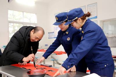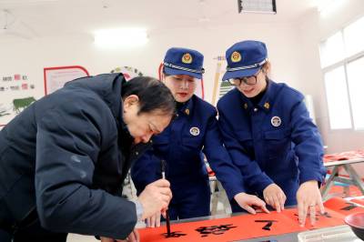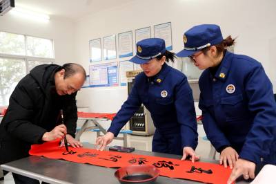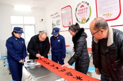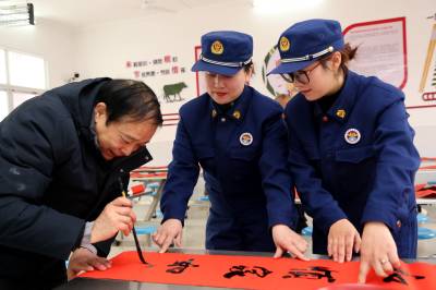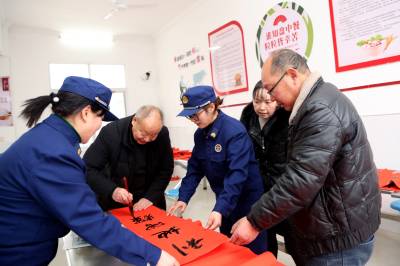 过年贴春联传递的是年味,传递的是祝福,传递的是一年起始对生活的向往和祝愿。1月31日,在湖北省襄阳市保康县城关镇社会福利院,当地书法爱好者与“火焰蓝”消防志愿服队组建的“关爱团”免费给老人题写春联福字,送平安祝福。