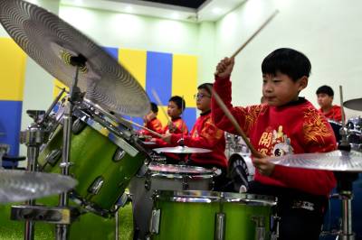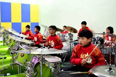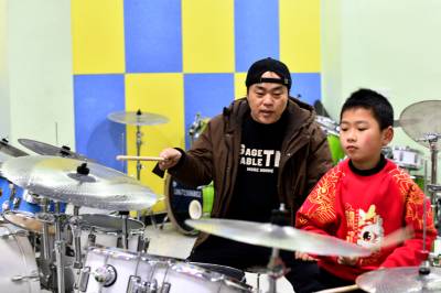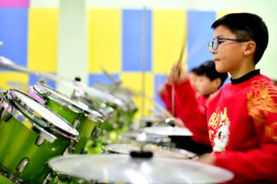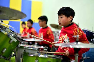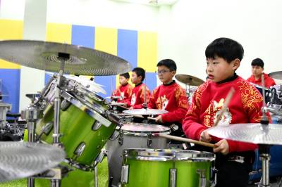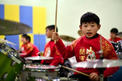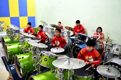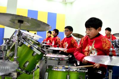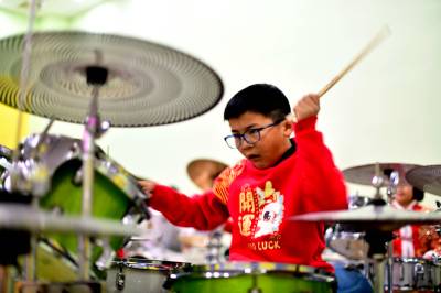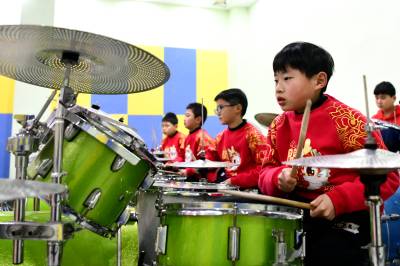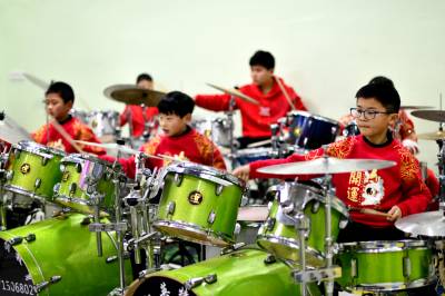 2024年2月4日,湖北省咸宁市通城县隽水镇白沙社区鼓瑟古香打击乐乐队的孩子们在练习架子鼓《说唱中国红》。