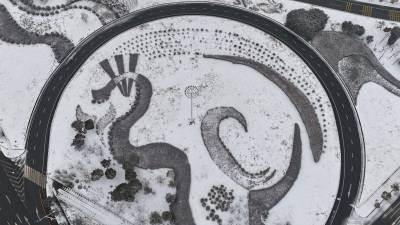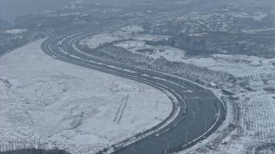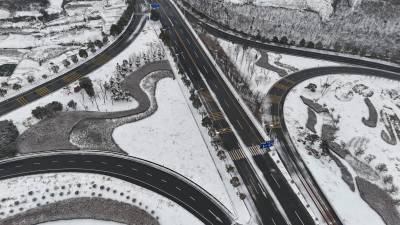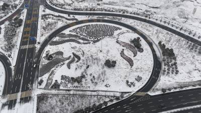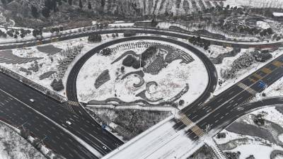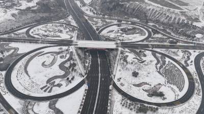 2月4日立春,南水北调中线工程核心水源区十堰市郧阳区持续降下大雪,山舞银蛇、原驰蜡象。立春降瑞雪,汉江景如画。2024年2月4日立春,郧阳区汉江、天马大道和十堰大道互通雪景如画。(无人机照片)视界网王涛摄
