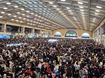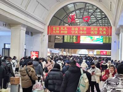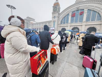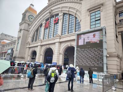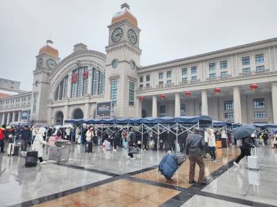2024年2月6日,农历腊月二十七,国铁武汉汉口站再迎春运返乡客流高峰。汉口火车站候车大厅内再现客流人头攒动人流如潮的壮观场景,熙熙攘攘的旅客拖着行李箱带着回家过龙年佳节的礼物,使候车大厅座无虚席,挤得水泄不通。当天因持续雨雪天气有许多趟列车停运,大面积列车晚点。中午12时20分左右,广场上排队进站候车人流明显增多起来,面对突然增大的客流。江汉区迅速启动了应急预案,在汉口火车站站前广场上,区汉口火车站地区综管办、区公安分局、区人武部、区文明办等组织了数百人,按照各负其责的原则,对广场上滞留旅客认真做好心理疏导解答工作,维护好现场治安稳定秩序,迅速搭起48顶遮风拦雨雪进车站的帐篷,免费为旅客提供按需领取姜汤、饼干、面包、矿泉水、热水等暖心服务,逐步解除了他们的后顾之忧,愉快踏上了返乡回家过龙年之旅。