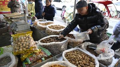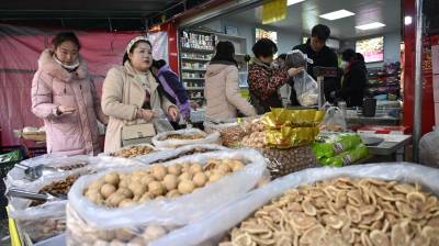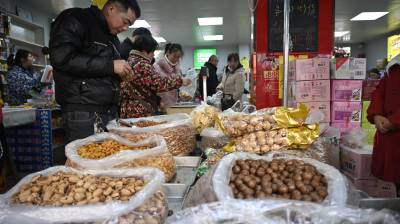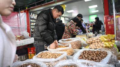 龙年春节临近,各地人们忙着置办年货,为即将到来的新年做准备。2024年2月8日,在十堰市郧阳区东岭街,人们在选购各种干果。视界网王涛摄
