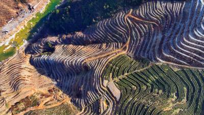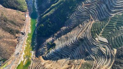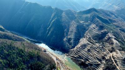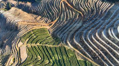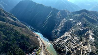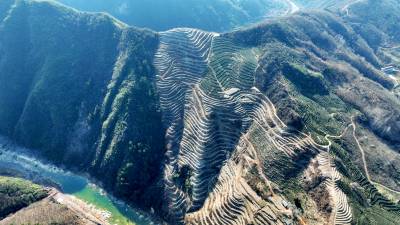 2024年2月9日,十堰市房县青峰镇青峰村小流域水土综合治理区层层梯田环绕云霄,绿色茶苗在微风中摇曳。