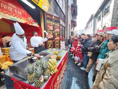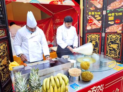 连日来,在武汉市园博园汉口里新春庙会里,来自印度的3名厨师,讲着一口顺利的中国普通话,现场吆喝他们动手做的香蕉、火腿、菠萝、榴莲四种口味的飞饼,吸引了众多市民和游客驻足观赏,先买先尝为快,为汉口里新春庙会添欢乐。