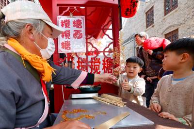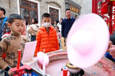 2月14日,湖北省襄阳市古城的大街小巷热闹非凡,人们逛古城、赏美景、品美食,在古城感受十足年味。