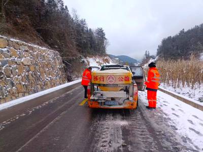 秭归县公路部门科学存放抗雪物资,确保各类除冰扫雪物资储备充足,机械设备运转正常,人员值守到位。公路部门共储备融雪剂35吨、工业盐30吨,除雪滚刷1台,融雪撒布机2台,装载机10台,挖掘机6台,巡查车8辆,运输车6辆,警示标志牌52个,警示锥桶325个。组织应急保畅队伍85人,出动巡查车22台次、设备36台套。视界网黄善军 吴宏伟摄