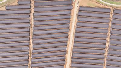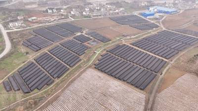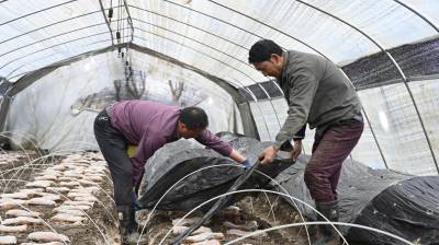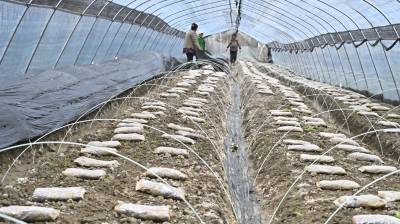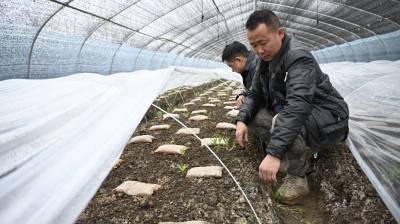 十堰市郧阳区五峰乡西峰村利用地处汉江河谷的天然气候、土地、水源优势,在本地能人兰敏俊等人的带动下,该村发展连片羊肚菌种植基地120亩,亩平产值达到5万元,带动当地闲散劳动力30多人就地务工,成为乡村振兴的好项目,为当地群众撑起“致富伞”。2024年3月6日,郧阳区五峰乡西峰村百亩羊肚菌种植基地,种植大户兰敏俊(前)正在大棚里查看羊肚菌生长情况。视界网王涛摄