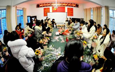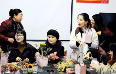 随后,女教师们围坐一起进行插花活动。他们在插花老师的指导下,拿着剪刀修理着花枝,一会儿桌面上摆起了一篮一篮美丽的花束。大家抱着花篮拍照,留下了永恒的美丽。