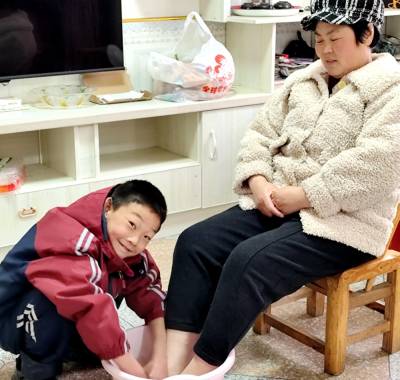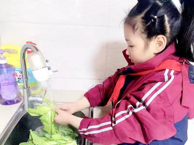 3月8日,竹山县竹坪小学学生采取精心地制作感恩贺卡,帮家人做拖地、洗菜、包饺子、浇花等家务,为老人们洗脚、揉肩、捶背等,用实际行动表达感恩之情,让长辈快乐过“三八”。(视界网张云朝 王喜苹摄)
