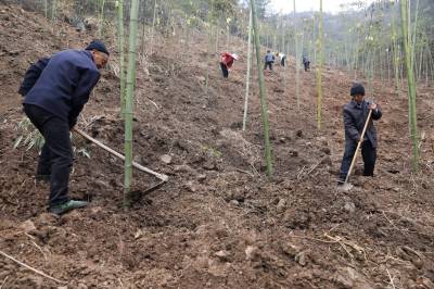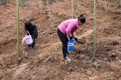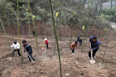 3月14日,竹山县溢水镇小东川村组织11名村民在鹰岩沟栽植斑竹,有的忙着挖窝,有的忙着培土、有的提水浇灌,确保竹苗成活。