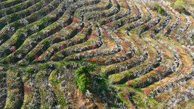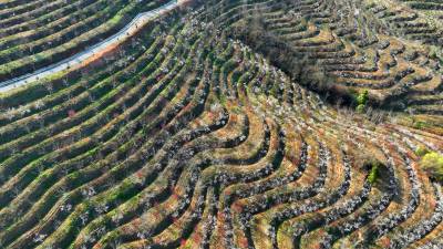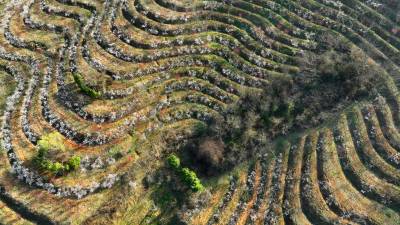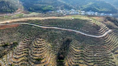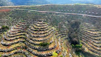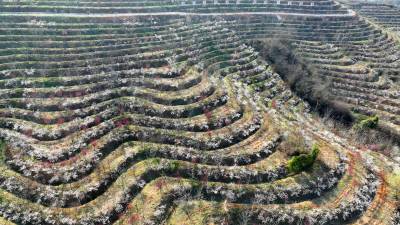 2024年3月14日,十堰市房县军店镇中村白鹤湾小流域山丘岗樱桃花、桃花、油菜花竟相绽放。