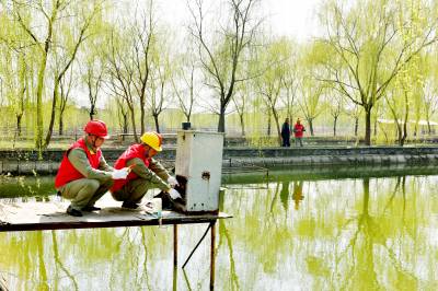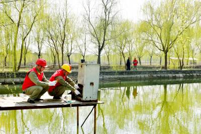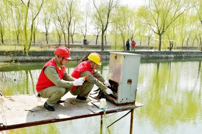 3月14日,在襄阳市樊城区太平店镇孙蔡村,国网襄阳供电公司樊城区供电中心的电力员工为湖北力帆农业科技开发有限公司的垂钓观光园检查用电设备,保障乡村旅游产业发展可靠用电。(郭峰 梅雪)
