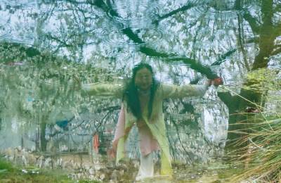雾里春溪 花映木屋