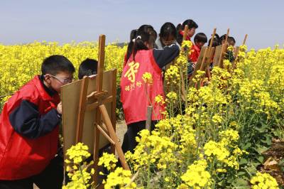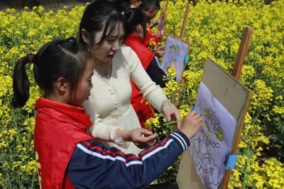 该校老师带领五年级学生来到学校附近的油菜花海进行实物写生,孩子们架起画架,仔细观察油菜花的茎、叶、花以及花的疏密关系、遮挡关系,通过细心调色、勾勒、涂画,把自己观察到的实物描绘出来,自信、开心洋溢在每一个孩子的脸上。